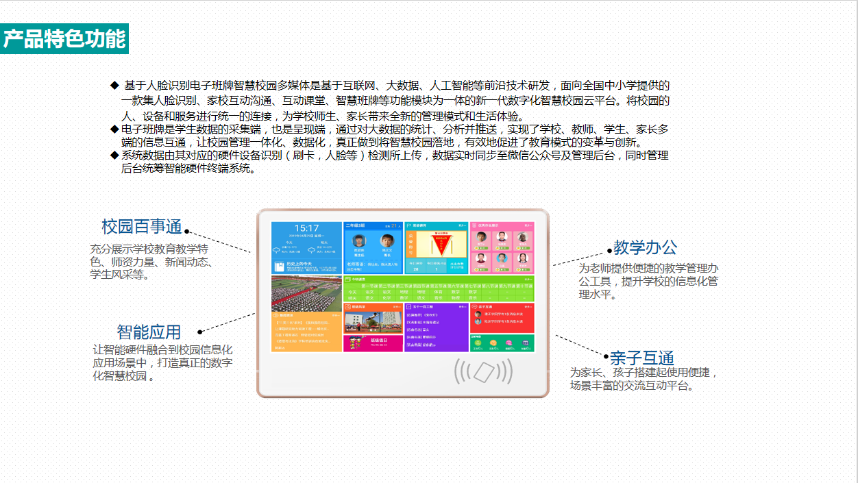 電子班牌—全方面展現(xiàn)師生風(fēng)采 班級文化建設(shè)的載體和展示途徑 電子班牌,是智慧校園建設(shè)最重要的組成部分之一。通常在每個教室門口配置一塊22寸(或其他尺寸)高清觸控屏,可以顯示課程信息、師生資料、班級風(fēng)采、榮譽展示等等內(nèi)容,還可以顯示時間、天氣預(yù)報、校園通知等公共信息,另外還可以進行學(xué)生考勤、考試安排、家長消息等互動操作。智慧班牌既提升了校園的整體形象,又充分的展現(xiàn)了校園風(fēng)采、豐富了校園生活,同時,也成了學(xué)校和班級,教師和學(xué)生,以及家長和學(xué)生之間的互動媒介之一。 |