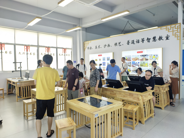 2025年7月14日,浙江省臺州市三門技師學院教師代表團蒞臨文興小書家參觀交流,實地考察智慧書法、美術、棋藝及沙畫教室等創新教育產品。雙方就數字化美育解決方案的應用前景展開深度探討,共同探索“科技+藝術”融合育人的新模式。