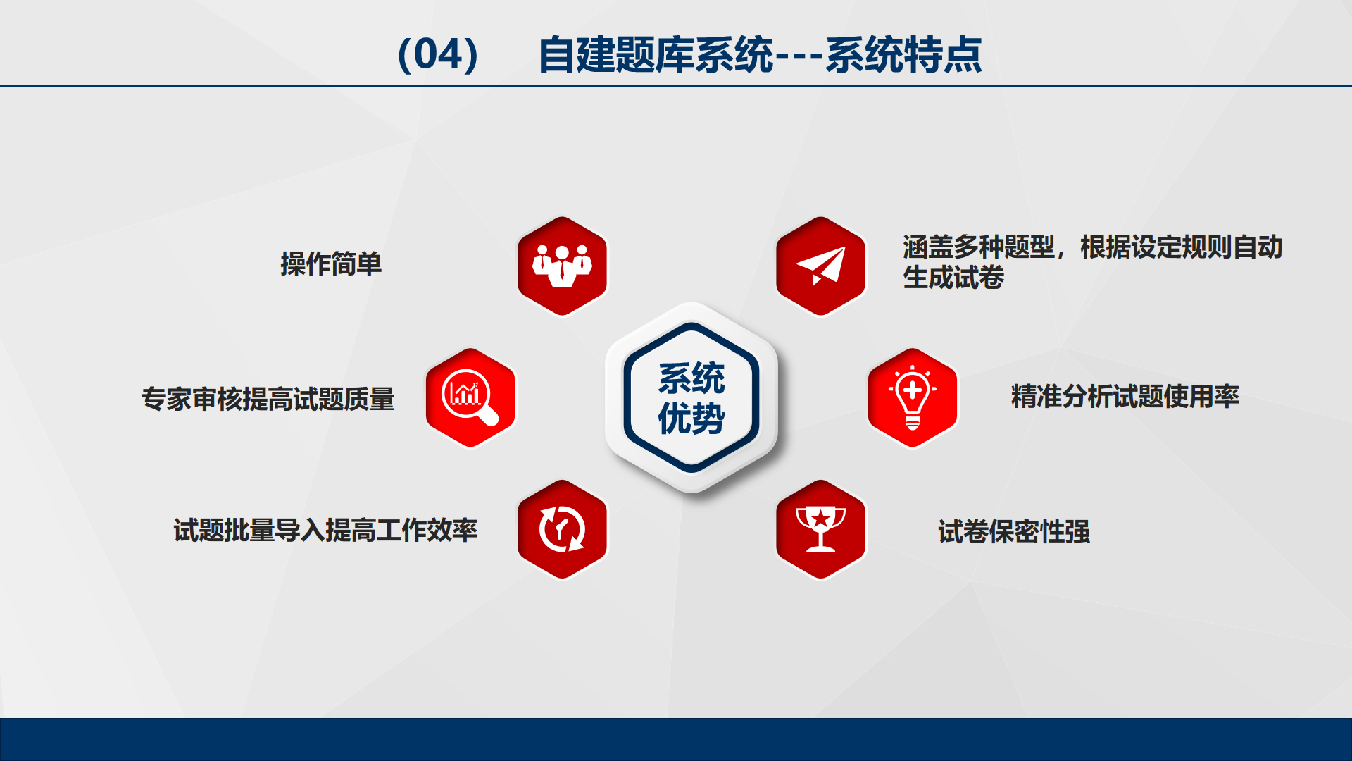 產(chǎn)品詳細(xì)介紹自建題庫管理系統(tǒng),系統(tǒng)實現(xiàn)了教考分離,操作簡單、涵蓋多種題型,根據(jù)設(shè)定規(guī)則自動生成試卷、專家審核提高試題質(zhì)量、精準(zhǔn)分析試題使用率、試題批量導(dǎo)入提高工作效率、試卷保密性強(qiáng)。