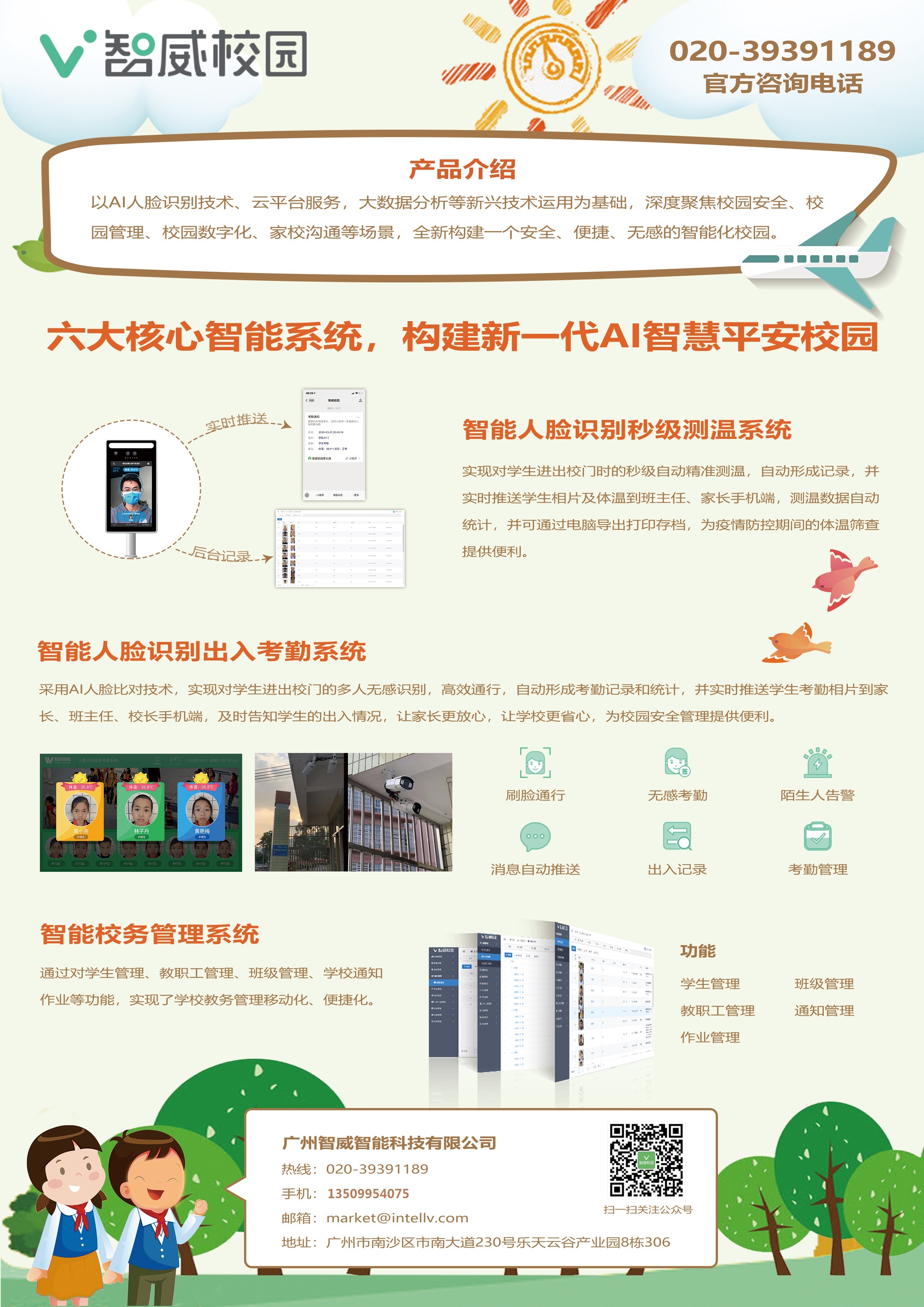 以AI人臉識別技術、云平臺服務,大數據分析,微信生態服務、熱成像測溫等新興技術運用為基礎,深度聚焦校園安全、校園管理、校園數字化、家校溝通等場景,全新構建一個安全、便捷、無感的智能化校園。