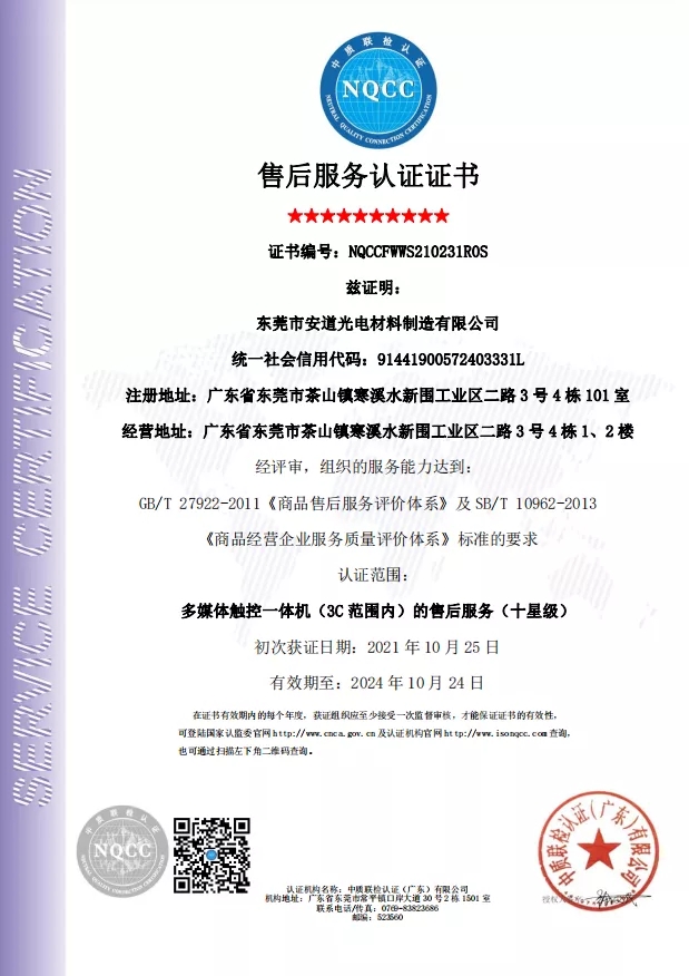 安道教育在提升產品品質的同時,堅持以用戶為中心打造了專業的售后服務體系得到了權威機構認證,獲得十星級售后服務認證