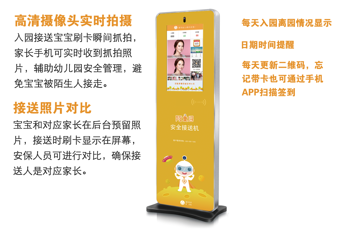 產(chǎn)品詳細(xì)介紹高清攝像頭實(shí)時(shí)拍攝 入園接送寶寶刷卡瞬間抓拍,家長(zhǎng)手機(jī)可實(shí)時(shí)收到抓拍照片,輔助幼兒園安全管理,避免寶寶被陌生人接走。 接送照片對(duì)比 寶寶和對(duì)應(yīng)家長(zhǎng)在后臺(tái)預(yù)留照片,接送時(shí)刷卡顯示在屏幕,安保人員可進(jìn)行對(duì)比,確保接送人是對(duì)應(yīng)家長(zhǎng)。 每天入園離園情況顯示 實(shí)時(shí)顯示當(dāng)天的入園、離園情況,方便老師出入園管理。 日期時(shí)間提醒 在醒目位置顯示日期時(shí)間,方便家長(zhǎng)、老師了解時(shí)間信息。 二維碼簽到 每天更新二維碼,忘記帶卡也可通過(guò)手機(jī)APP掃描簽到。 園務(wù)通知、校園新聞顯示 無(wú)人刷卡期間,屏幕顯示幼兒園的新聞、通知、活動(dòng)信息,方便家長(zhǎng)老師查看,對(duì)幼兒園起到很好的宣傳作用。 |