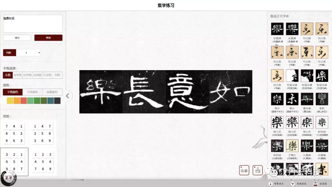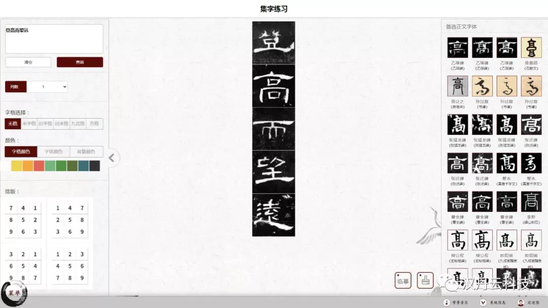 漢丹云智慧書法教室軟件能夠根據用戶需求,任意選調《曹全碑》中的例字,并將其按照需要的版式,1-16字選擇排版,當場形成書寫字帖,在桌面電腦上可觀賞可臨寫可描摹十分方便!