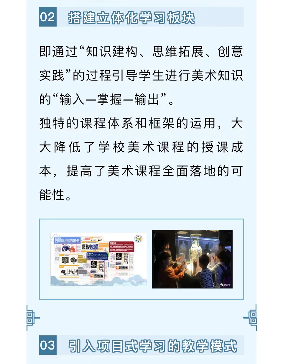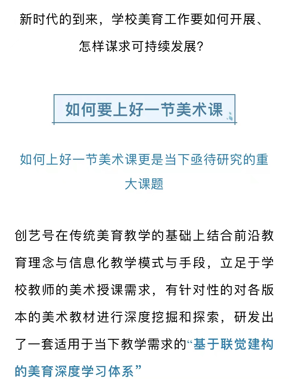區(qū)域美育整體解決方案。創(chuàng)藝號美育綜合建設(shè)方案,做到“三建設(shè),三提升”,建設(shè)美育創(chuàng)新型課程模式,提升區(qū)域整體教學(xué)能力;建設(shè)美育發(fā)展性評價體系,提升學(xué)生藝術(shù)綜合素養(yǎng);建設(shè)美育專業(yè)化場地課程,提升學(xué)校優(yōu)質(zhì)特色發(fā)展,有效服務(wù)美育進(jìn)校園、進(jìn)中考。