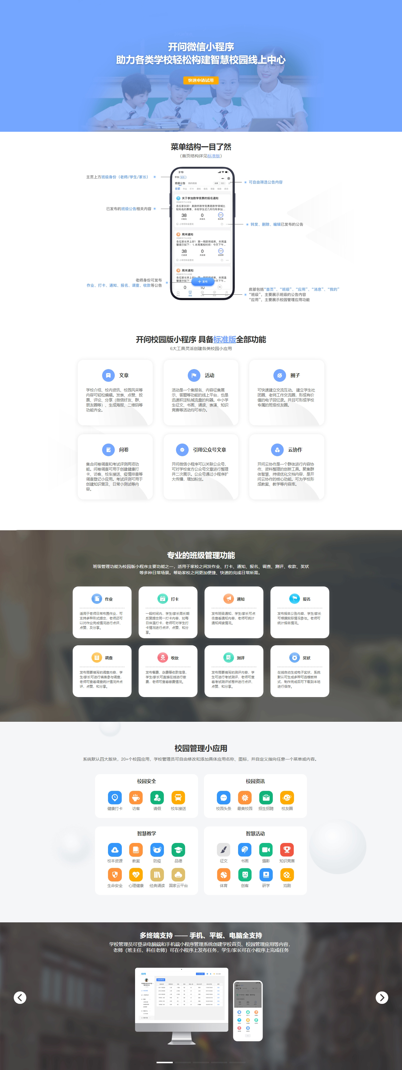 產品詳細介紹開問校園版小程序6大工具靈活創建各類校園小應用: 1、資訊 學校介紹、校內資訊、校園風采等內容可輕松編輯。發表、點贊、投票、評論、分享(微信好友、群、朋友圈等)、生成海報、二維碼等功能齊全。 2、校園、班級活動 活動是一個集報名、內容征集展示、答題等功能的線上平臺,也是迅速積淀私域流量的利器。中小學生征文、書畫、誦讀、表演、知識競賽等活動均可舉辦。 3、班級圈子 可快速建立交流互動。 建立學生社團圈、老師工作交流圈,形成有價值的電子回憶錄。并且可形成學校專屬的班級校友圈。 4、考試 集合問卷調查和考試評測兩項功能。問卷調查可用于創建健康打卡、訪客、校車接送、疫情排查等調查登記小應用。考試評測可用于創建知識普及、日常小測試等內容。 5、引用公眾號文章 開問微信小程序可以關聯公眾號,可對學校官方公眾號文章進行整理并二次展示。公眾號通過小程序擴大傳播,增加粉絲,助力學校招生! 6、云協作 云協作是一個群體進行內容協作、資料整理的創新工具。聚集群體智慧、持續優化文檔內容,是開問云協作的核心功能。可為學校形成教案、教學等內容庫。 |