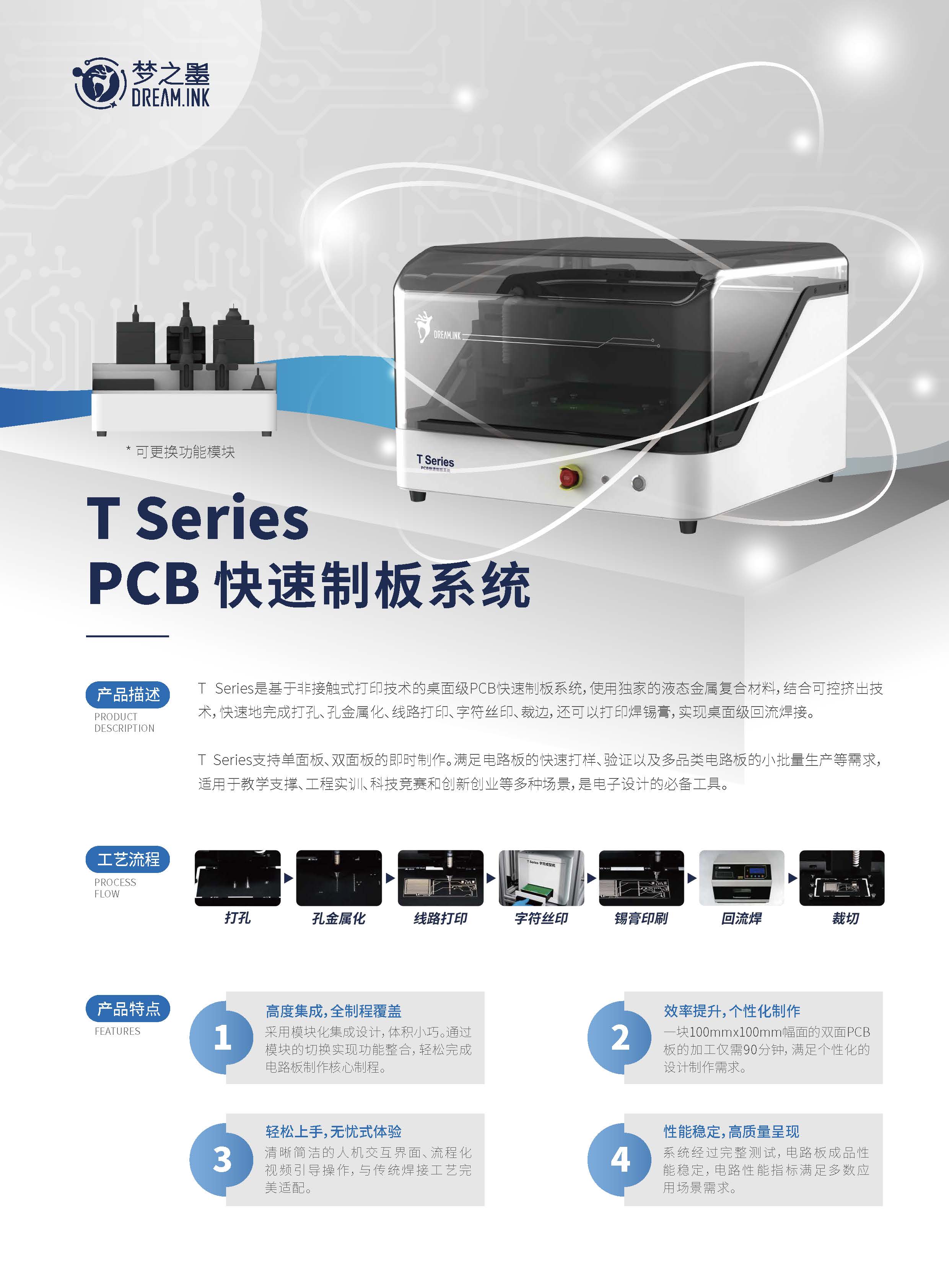 產品詳細介紹產品描述 T Series是基于非接觸式打印技術的桌面級PCB快速制板系統(tǒng),使用液態(tài)金屬復合材料,結合可控擠出技術,快速地完成打孔、孔金屬化、線路打印、字符絲印、裁邊,還可以打印焊錫膏,實現(xiàn)桌面級回流焊接。 T Series支持單面板、雙面板的即時制作。滿足電路板的快速打樣、驗證以及多品類電路板的小批量生產等需求,適用于教學支撐、工程實訓、科技競賽和創(chuàng)新創(chuàng)業(yè)等多種場景,是電子設計的必備工具。 產品特點 1、高度集成,全制程覆蓋 采用模塊化集成設計,體積小巧。通過模塊的切換實現(xiàn)功能整合; 2、效率提升,個性化制作 一塊100mmx100mm幅面的雙面PCB板的加工僅需90分鐘,滿足個性化的設計制作需求; 3、輕松上手,無憂式體驗 清晰簡潔的人機交互界面、流程化視頻引導操作,與傳統(tǒng)焊接工藝完美適配; 4、性能穩(wěn)定,高質量呈現(xiàn) 系統(tǒng)經過完整測試,電路板成品性能穩(wěn)定,電路性能指標滿足多數(shù)應用場景需求。 |