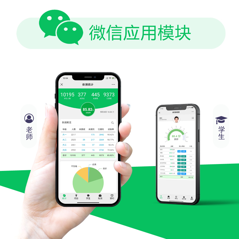 ①公眾號配置 配置公眾號的參數設置及開通功能 配置公眾號與平臺的互聯互通功能 提供公眾號二唯碼及綁定步驟的流程 設置平臺通知、推送等功能 ②平臺微信功能集成 將體測成績/免測里集成微信推送功能 按行政班/體育班推送班級通知 預約測試中對符合篩選條件/已預約的學生進行推送通知 ③學生端 可通過學生賬號綁定微信公眾號一鍵登錄 可查看本人的體測成績、免測申請、預約測試、體育選課,修改我的資料 可接收手持機現場采集的體測成績及評分提示 可接收體測成績提示 可接收免予測試申請的審核結果通知 可接收行政班/體育班推送班級通知 可接收預約測試相關通知 ④老師端 可通過教師賬號綁定微信公眾號一鍵登錄 可查看年級/班級/各項目的統計數據及名單 管理員可查詢學生測試成績 體育教師可查看自己教學班的學生測試成績 可查看免測名單并審核 可查看預約測試的記錄及學生 |