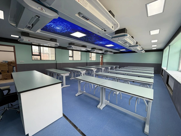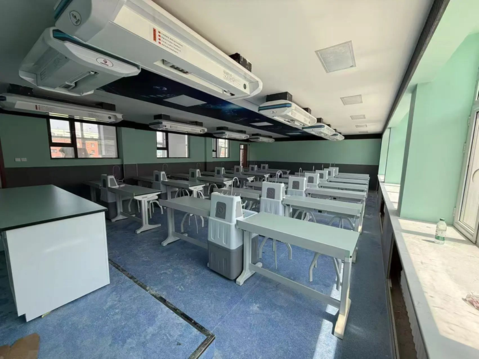 化學(xué)吊裝實驗室打破了傳統(tǒng)實驗室地面建設(shè)施工方式,從地面走向頂部。融合了先進的通風(fēng)系統(tǒng)、安全設(shè)施以及高效的教學(xué)設(shè)備,旨在為學(xué)生提供一個安全、健康、高效的實驗環(huán)境。其整體基于頂層通風(fēng)的設(shè)計思路,通過吸風(fēng)罩、通風(fēng)管和排風(fēng)機等設(shè)備,將實驗過程中產(chǎn)生的有毒有害氣體及時排出室外。采用萬向吸風(fēng)罩上排風(fēng)方式,解決下排風(fēng)管道安裝難度大的問題。具有科學(xué)布局、靈活多變、節(jié)省空間等優(yōu)勢。