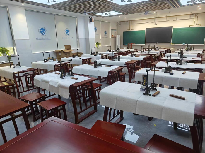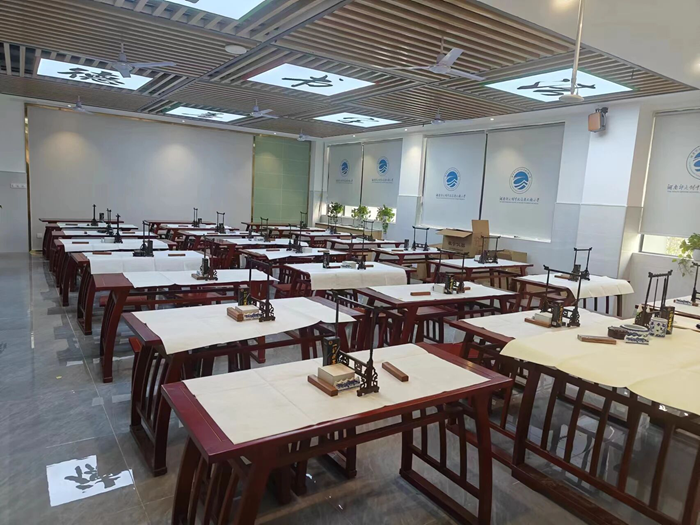 仿古實木書法桌、專業(yè)筆掛、硯臺池一應(yīng)俱全;墻飾以國學(xué)經(jīng)典字畫,配備了現(xiàn)代化的多媒體教學(xué)設(shè)備,方便老師示范運筆細(xì)節(jié),實現(xiàn)傳統(tǒng)與現(xiàn)代的完美融合。