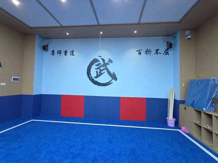鋪設(shè)專業(yè)武術(shù)軟墊,有效保護學(xué)生在翻滾跳躍時免受傷害;墻飾以“武道”渲染,整個空間洋溢著陽剛正氣與紀(jì)律感。