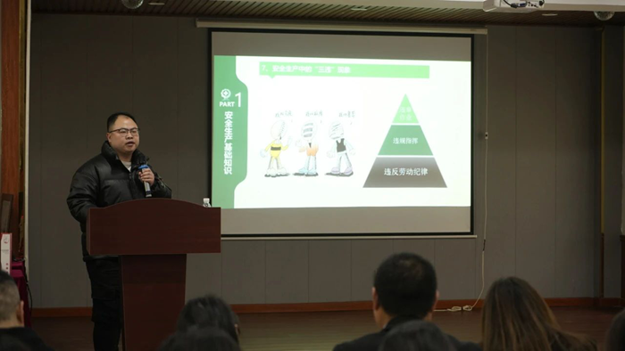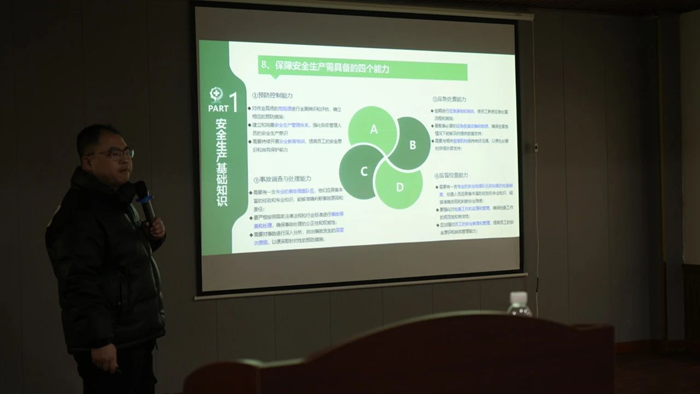 培訓伊始,賀廠首先闡述了安全生產的定義及其重要意義。安全生產是指在勞動生產過程中,通過努力改善勞動條件,克服不安全因素,防止事故的發(fā)生,確保企業(yè)生產在保證勞動者安全健康和國家財產及人民生命財產安全的前提下順利進行。隨后,賀廠詳細講解了我國安全生產的方針——“安全第一,預防為主,綜合治理”,以及公司職業(yè)健康安全管理方針,讓員工們深刻認識到安全生產的重要性和緊迫性。