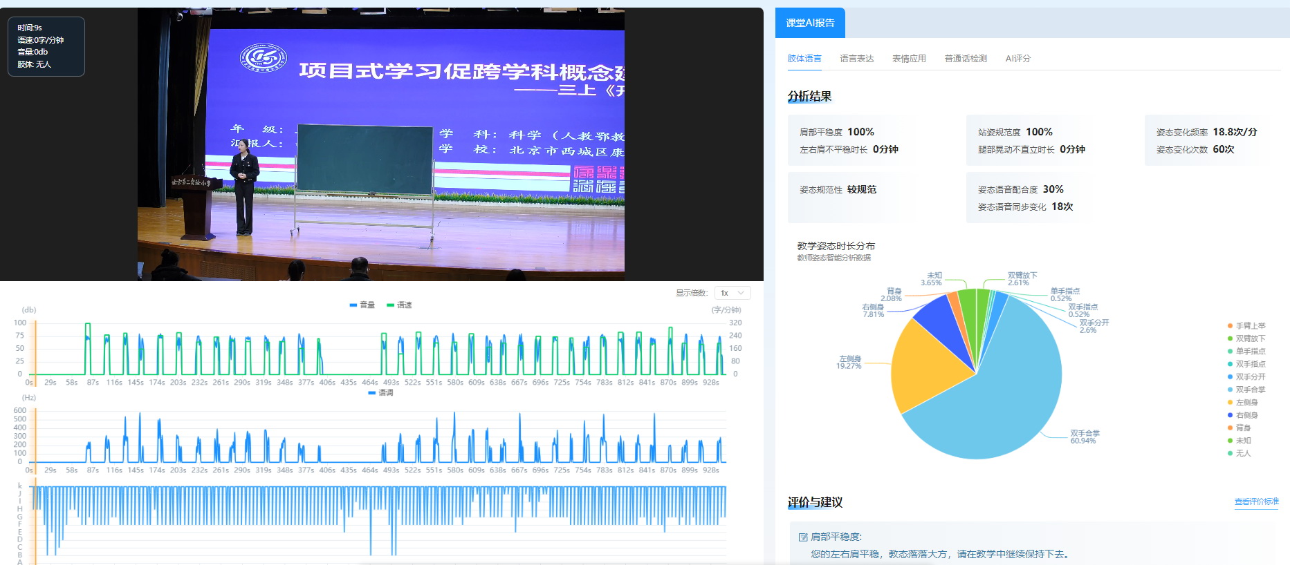 AI同步對兩位老師的微格教學進行了數據采集與分析。對于本次微課教學,傳統基于課堂的AI數據分析顯然不合適。這一次,現代中慶AI聚焦教師的教學基本技能,對說課教師的肢體動作、語言表達、表情、普通話等外顯的教學功行為進行數據采集和分析。