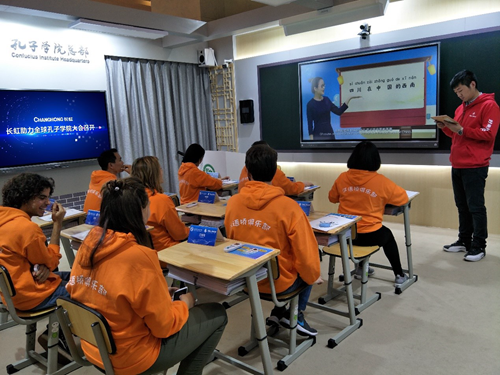 長虹智慧教室從智慧教學、智慧環境智慧管理三大方面設計規劃,將AI人工智能、云計算和物聯網技術與教育教學相融合,以人機互動的形式為漢語學習者提供教學和學習,也為全球的孔子學院建立智慧教室提供了樣本。