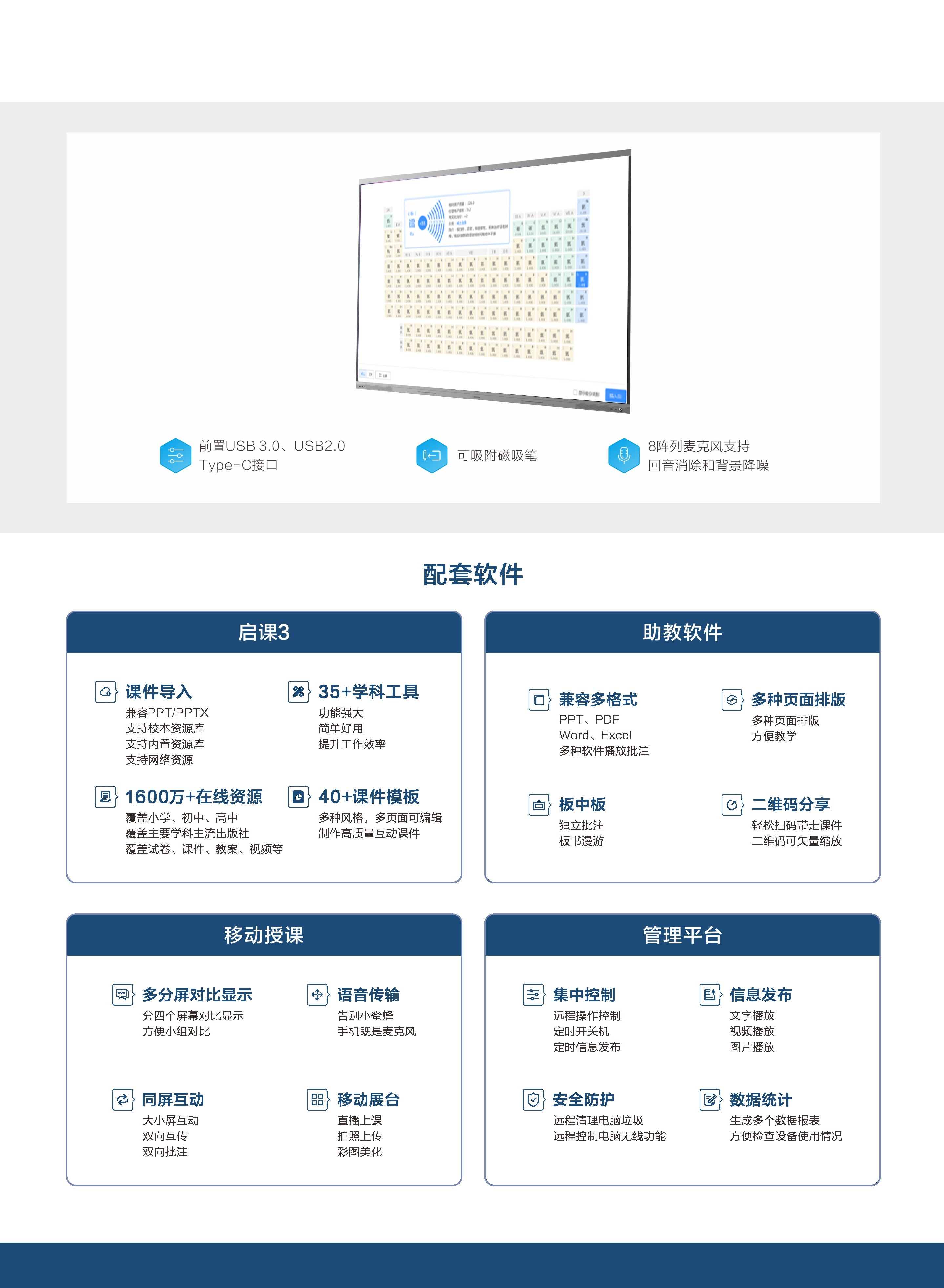 交互智能平板、智慧黑板、信創國產化智慧終端、教學相關軟件、端云一體軟硬件產品、數智校園硬件工具與數字課堂教學應用、新型智慧教室解決方案、數智課堂解決方案、數智教育區縣解決方案、職校教育信息化解決方案、高校智慧教室解決方案、信創智能終端及平臺解決方案,系統運營維護整體解決方案、Ai智慧體育解決方案