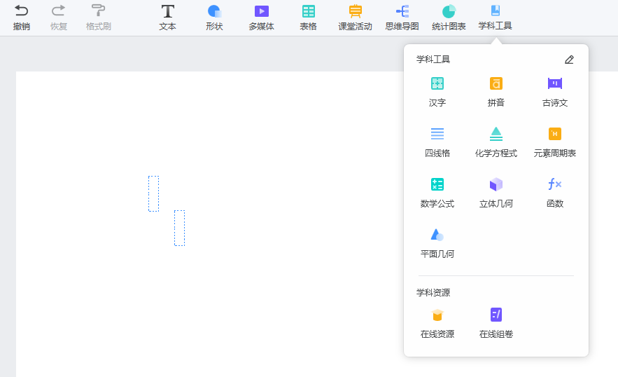 在不同的學科課件備課中,長虹啟課3的學科工具版塊提供了“漢字”、“拼音”、“古詩文”、“四線格”、“化學方程式”、“元素周期表”“數學公式”等多類型的學科教材內容。按照學段選擇課程內容插入到課件中,可直接向學生展示今天的課程內容,也可以選擇重難點講解、本節課程的重難點內容、課程的拓展知識等,教學完主要內容后,還可對某個重點知識進行單獨講解。