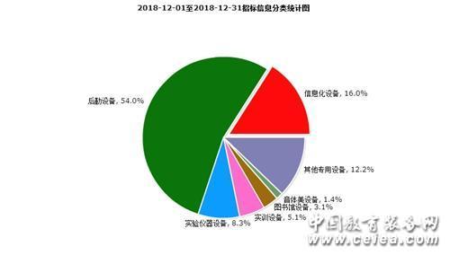 如圖1所示,12月份教育裝備行業(yè)招標采購信息分類占比情況為:后勤設(shè)備招標采購信息共計1699條,占53.99%;信息化設(shè)備招標采購信息共計502條,占15.95%;實驗儀器設(shè)備招標采購信息共計260條,占8.26%;實訓(xùn)設(shè)備招標采購信息共計161條,占5.12%;圖書館設(shè)備招標采購信息共計97條,占3.08%;音體美設(shè)備招標采購信息共計44條,占1.40%;其他專用設(shè)備招標采購信息共計384條,占12.20%。