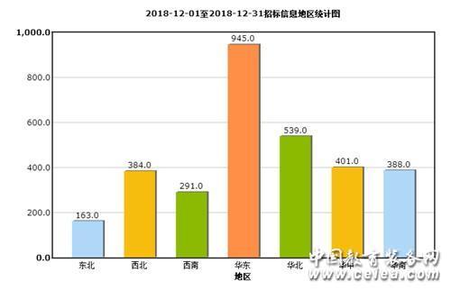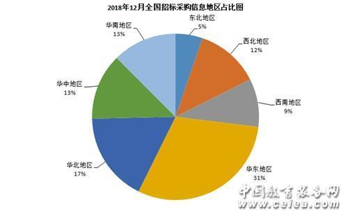 從12月招標采購信息地區(qū)統(tǒng)計圖(如圖3所示)和全國招標采購信息量地區(qū)占比圖(如圖4所示)來看:華東地區(qū)招標采購信息量為945條,占比31%;華北地區(qū)招標采購信息量為539條,占比17%;華中地區(qū)招標采購信息量為401條,占比13%;華南地區(qū)招標信息采購量為388條,占比13%;西北地區(qū)招標采購信息量為384條,占比12%;西南地區(qū)招標采購信息量為291條,占比9%;東北地區(qū)招標采購信息量為163條,占比5%。