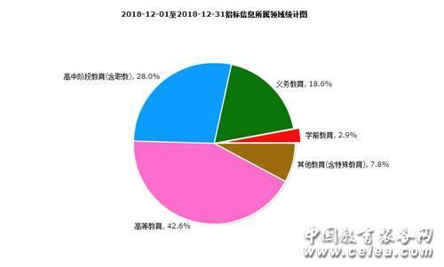 從12月招標采購信息所屬領(lǐng)域統(tǒng)計圖(如圖6所示)上看,學(xué)前教育占比為2.9%;義務(wù)教育占比為18.6%;高中階段教育(含職教)占比為28.0%;高等教育占比為42.6%;其他教育(含特殊教育)占比為7.8%。