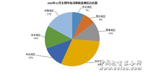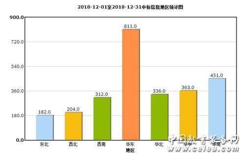 從12月中標信息地區(qū)統(tǒng)計圖(如圖8所示)和全國中標信息地區(qū)占比圖(如圖9所示)來看:華東地區(qū)中標信息量為811條,占比30%;華南地區(qū)中標信息量為451條,占比17%;華中地區(qū)中標信息量為363條,占比14%;華北地區(qū)中標信息量為336條,占比12%;西南地區(qū)招中標信息量為312條,占比12%;西北地區(qū)中標信息量為204條,占比8%;東北地區(qū)中標信息量為182條,占比7%。