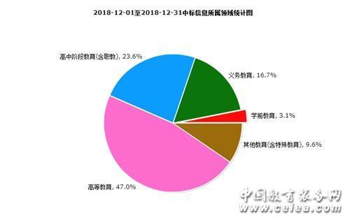 12月中標信息所屬領(lǐng)域統(tǒng)計圖,如圖10所示:學(xué)前教育占比為3.1%;義務(wù)教育占比為16.7%;高中階段教育(含職教)占比為23.6%;高等教育占比為47.0%;其他教育(含特殊教育)占比為9.6%。