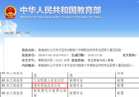 2018年3月,人社部印發《人力資源社會保障部關于頒布<全國技工院校專業目錄(2018年修訂)>的通知》,決定自今年(2018)秋季學期開始施行2018版技工院校專業目錄。其中新《目錄》新增專業第一大類——機械類明確專業就有“3D打印技術應用”等新興技術。2019年1月,教育部公布《中等職業學校專業目錄(征求意見稿)》。其中,05加工制造專業大類中新增增材制造技術(3D打印)應用專業。