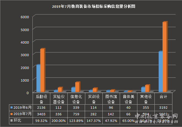 環比來看,7月份各類別招標采購信息量均有大幅的增長。暑期除后勤設備以外,其他各類別設備的需求量也有著顯著的提升,也說明了暑期是學校集中采購的重要階段。