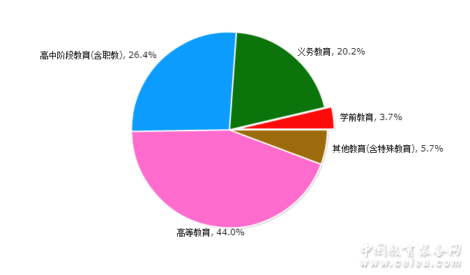 7月中標信息所屬領域統計圖,如圖10所示:學前教育占比為3.7%;義務教育占比為20.2%;高中階段教育(含職教)占比為26.4%;高等教育占比為44.0%;其他教育(含特殊教育)占比為5.7%。