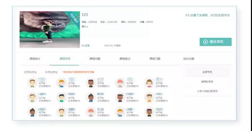 教師可實時查看每節(jié)課上課統(tǒng)計,其中包括:課程學員、課程問題、課程筆記、課程習題等;