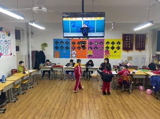 在大成小學(xué)教室,四年級一個班的學(xué)生正在上英語興趣課。教室正中的大屏幕上,活力十足的英語老師一口標準流利的英語。線下,幾十個孩子齊聲跟讀。英語老師把一個單詞拆分并輔之以豐富的肢體語言,并配以動畫畫面,孩子們學(xué)得十分專注。