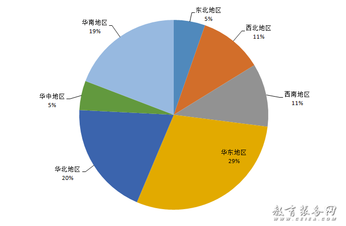 根據8月份收集到的教育裝備招標采購信息(見圖2、圖3):教育裝備招標采購區域信息數據共4132條(招標采購信息地區設置為單選項)。其中,華東地區招標采購信息量1213條,占區域信息量的29%;華北地區招標采購信息量803條,占區域信息量的20%;華南地區招標采購信息量793條,占區域信息量的19%;西北地區招標采購信息量449條,占區域信息量的11%;西南地區招標采購信息量446條,占區域信息量的11%;東北地區教育裝備招標采購信息量221條,占區域信息量的5%;華中地區招標采購信息量207條,占區域信息量的5%。
