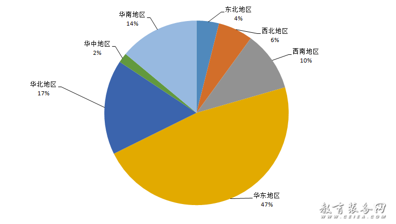 8月份教育裝備招標采購區域信息數據共3518條(中標信息區域設置為單選項)見圖6、圖7,華東地區中標信息量1659條,占區域信息量的47%;華北地區中標信息量586條,占區域信息量的17%;華南地區中標信息量491條,占區域信息量的14%;西南地區中標信息量370條,占區域信息量的10%;西北地區中標信息量214條,占區域信息量的6%;東北地區教育裝備中標信息量138條,占區域信息量的4%;華中地區中標信息量60條,占區域信息量的2%。