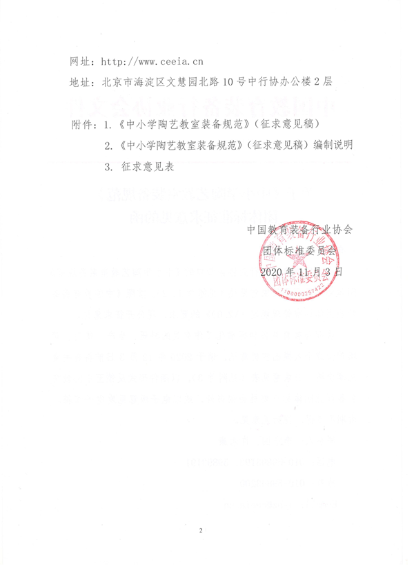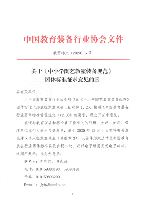 中國教育裝備行業協會團體標準委員會關于《中小學陶藝教室裝備規范》團體標準征求意見的函