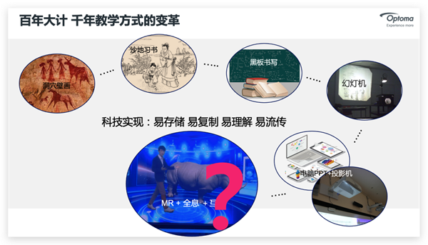 我們先來看一張演變圖,遠(yuǎn)古時(shí)期人類靠在山體洞穴壁畫等物體上通過硬物擊打,雕琢,用原始的圖案?jìng)鬟f和表達(dá);之后就有了竹簡,沙地習(xí)書等等;發(fā)展到了我們熟悉的板書,這個(gè)時(shí)期已成了很普及很廣泛的受教方式,但不可避免的是相同的課件內(nèi)容和信息傳授都無法重復(fù)利用,耗時(shí)耗力;幻燈機(jī)的出現(xiàn)改善了相同教案重復(fù)利用;再到后來,pc結(jié)合投影機(jī)的出現(xiàn),成了現(xiàn)代教學(xué)的主導(dǎo);那接下來,今后的教學(xué)方式又將發(fā)生怎樣的革新?