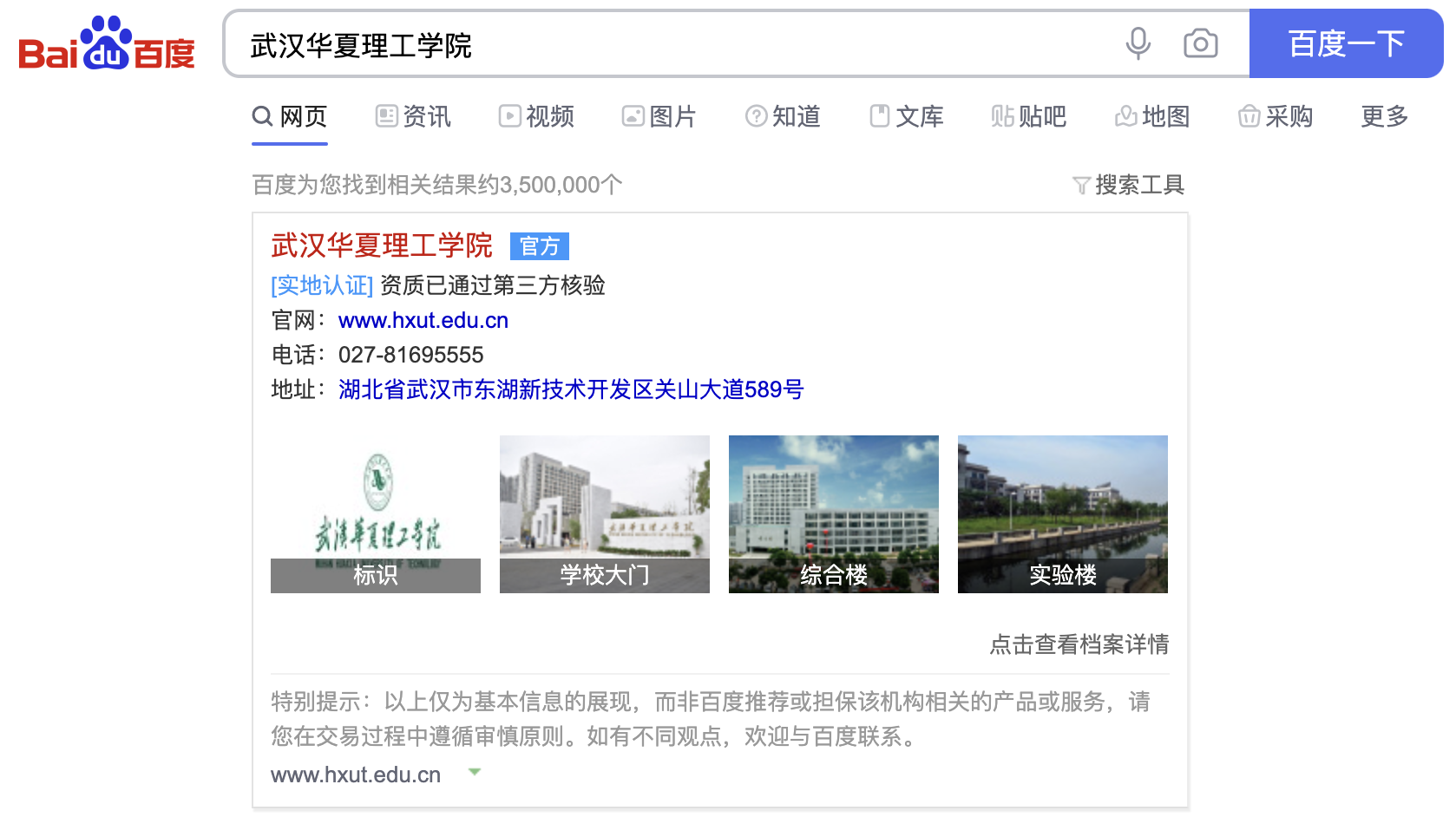 除了線下針對就業(yè)指導開展一系列活動以外,武漢華夏理工學院還通過多元的外宣手段提高學校的公信力,以幫助提升和鞏固本校畢業(yè)生在外求職時的競爭力。武漢華夏理工學院與百度信譽和武漢空格達成了長期的緊密合作,通過武漢空格做了百度認證服務和展示,給學生、家長以及對學校關注的網友提供了真實有效的認證信息,讓學校優(yōu)質的師資力量、場地優(yōu)勢、校園環(huán)境等通過客觀的第三方認證和百度的大搜索平臺展示到大眾面前。