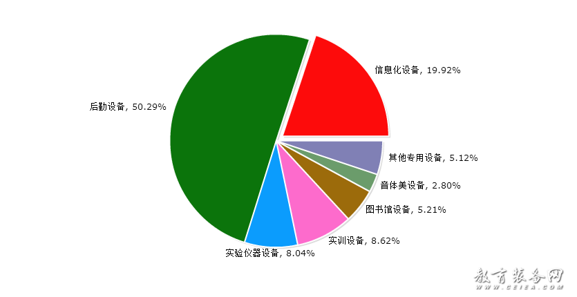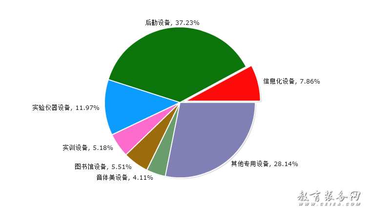 根據對教育裝備細分的歸納,教育裝備網將教育裝備具體劃分為七大類,即信息化設備(含智能平板、錄播系統、智慧黑板等),后勤設備(含校園基建、安防設備、食堂設備、課桌椅等),實驗儀器設備(含儀器儀表、實驗室平臺等),實訓設備(含實訓系統、實訓設施等),圖書館設備(含借還系統、微型圖書館等),音體美設備(含樂器、體育設施、美術用品等),其他專用設備(含創客教育、心理健康特教設備等)。