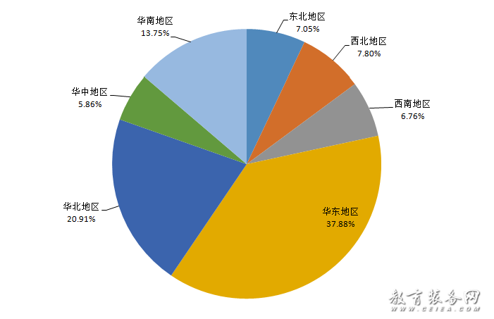 根據5月份收集到的教育裝備招標采購信息(見圖2、圖3):教育裝備招標采購區域信息數據共3448條(招標采購信息地區設置為單選項)。其中,華東地區招標采購信息量1306條,占區域信息量的37.88%;華北地區招標采購信息量721條,占區域信息量的20.91%;華南地區招標采購信息量474條,占區域信息量的13.75%;西北地區招標采購信息量269條,占區域信息量的7.80%;東北地區招標采購信息量243條,占區域信息量的7.05%;西南地區招標采購信息量233條,占區域信息量的6.76%;華中地區教育裝備招標采購信息量均為202條,占區域信息量的5.86%。