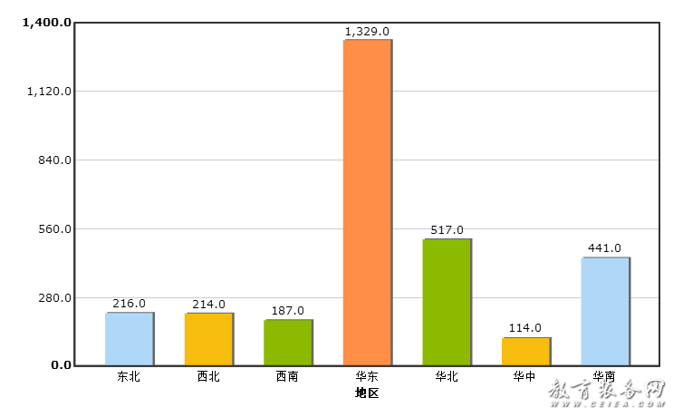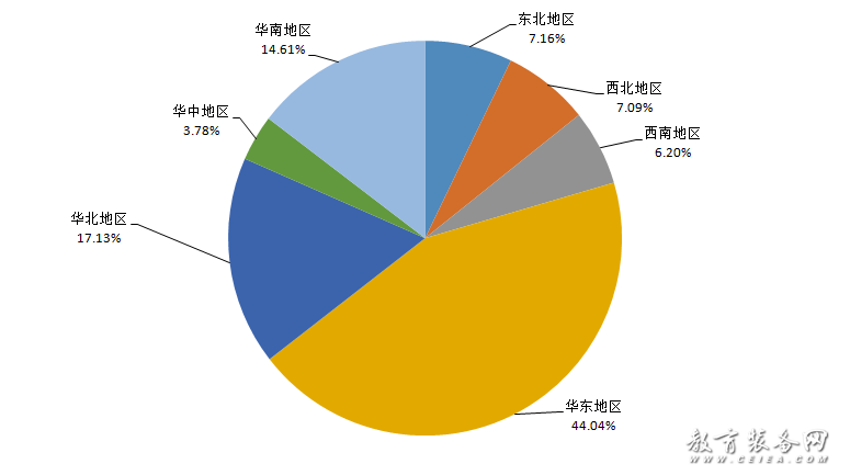 5月份教育裝備中標采購區域信息數據共3018條(中標信息區域設置為單選項)見圖6、圖7,華東地區中標信息量1329條,占區域信息量的44.04%;華北地區中標信息量517條,占區域信息量的17.13%;華南地區中標信息量441條,占區域信息量的14.61%;東北地區教育裝備中標信息量216條,占區域信息量的7.16%;西北地區中標信息量214條,占區域信息量的7.09%;西南地區中標信息量187條,占區域信息量的6.20%;華中地區中標信息量114條,占區域信息量的3.78%。