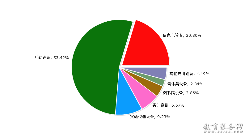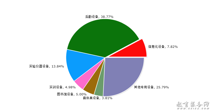 根據對教育裝備細分的歸納,教育裝備網將教育裝備具體劃分為七大類,即信息化設備(含智能平板、錄播系統、智慧黑板等),后勤設備(含校園基建、安防設備、食堂設備、課桌椅等),實驗儀器設備(含儀器儀表、實驗室平臺等),實訓設備(含實訓系統、實訓設施等),圖書館設備(含借還系統、微型圖書館等),音體美設備(含樂器、體育設施、美術用品等),其他專用設備(含創客教育、心理健康特教設備等)。