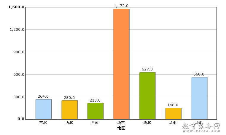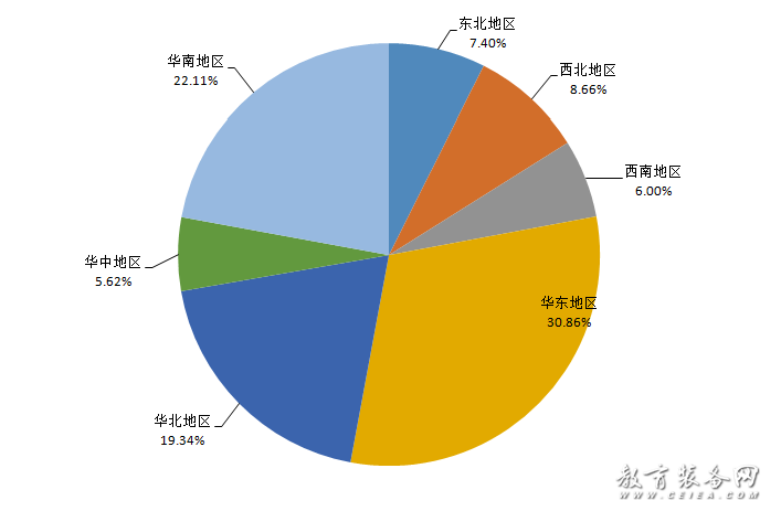 根據6月份收集到的教育裝備招標采購信息(見圖2、圖3):教育裝備招標采購區域信息數據共3717條(招標采購信息地區設置為單選項)。其中,華東地區招標采購信息量1147條,占區域信息量的30.86%;華南地區招標采購信息量822條,占區域信息量的22.11%;華北地區招標采購信息量719條,占區域信息量的19.34%;西北地區招標采購信息量322條,占區域信息量的8.66%;東北地區招標采購信息量275條,占區域信息量的7.40%;西南地區招標采購信息量223條,占區域信息量的6.00%;華中地區教育裝備招標采購信息量均為209條,占區域信息量的5.62%。