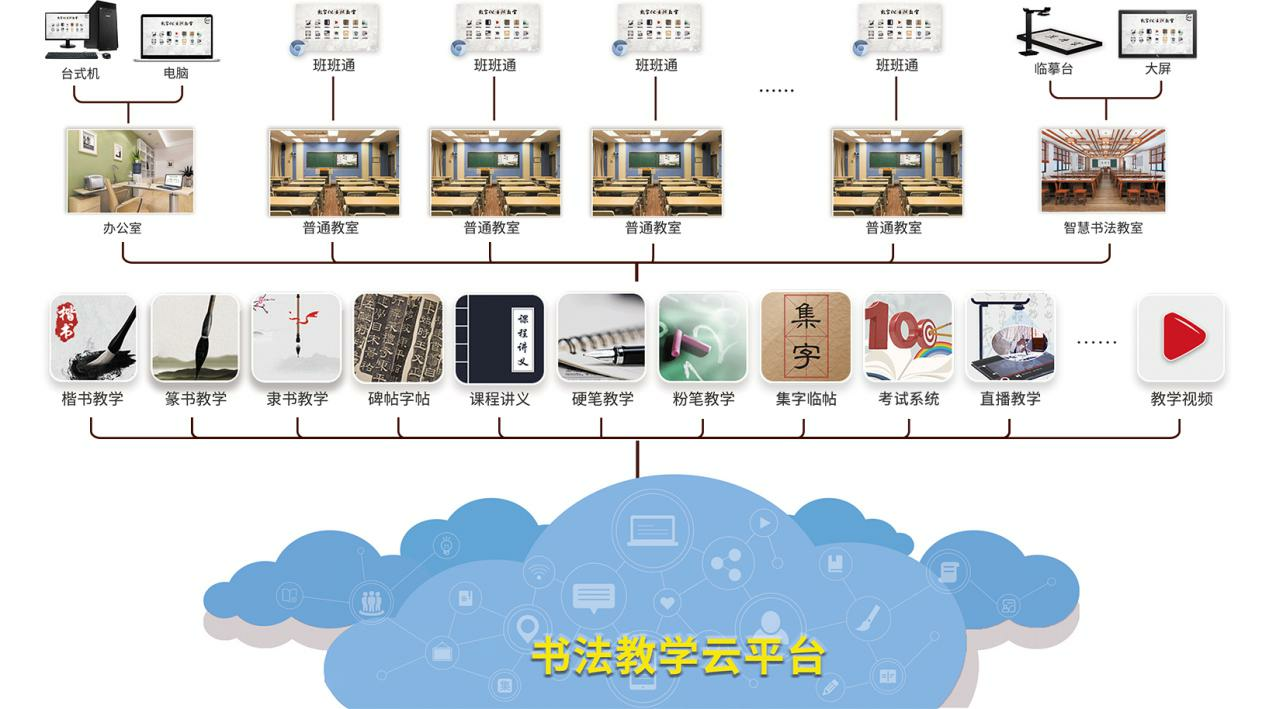 漢丹云智慧書法云教室依托行業領先的云平臺構建書法云服務,讓學校所有教室都可以開展書法教學工作,解決學校教室緊張、排課困難和師資緊缺等多方面問題。書法專用教室在日常教學排課中,存在資源緊張,排課困難的情況,很難保證每個學生的課時安排;同時書法課除保證日常教學外,為達到好的教學效果,還需為學生提供額外的書法練習課,所以書法專用教室完全不能滿足日常教學使用。因此,將依據互聯網+教育理念打造網絡化的智慧書法教室,接入書法教學云平臺,讓所有教室都可以開展書法教學工作,解決書法功能教室排課緊張問題;師生可以在校園任何接入網絡的設備上都可登陸書法云平臺開展書法教學工作,賦能書法課堂和校園內外,讓教學工作不受制于課堂。