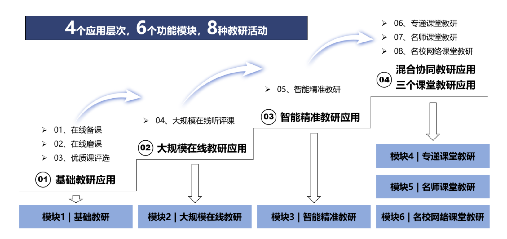針對“四階策略”的應用,中慶智能研修推出六個應用模塊,即基礎教研、大規模在線教研、智能精準教研、專遞課堂教研、名師課堂教研和名校網絡課堂教研六個應用模塊,以支撐區域與學校開展在線備課、在線磨課、優質課評選、大規模聽評課、智能精準教研、專遞課堂課堂教研、名師課堂教研、名校網絡課堂教研等8種不同類型教研活動。