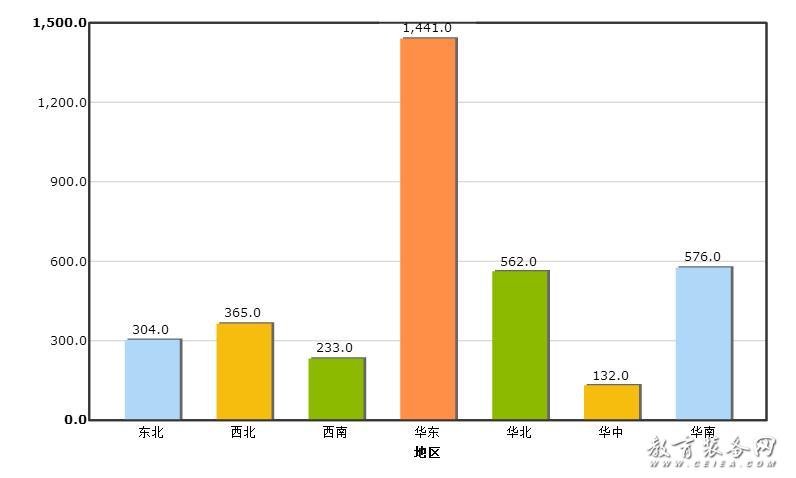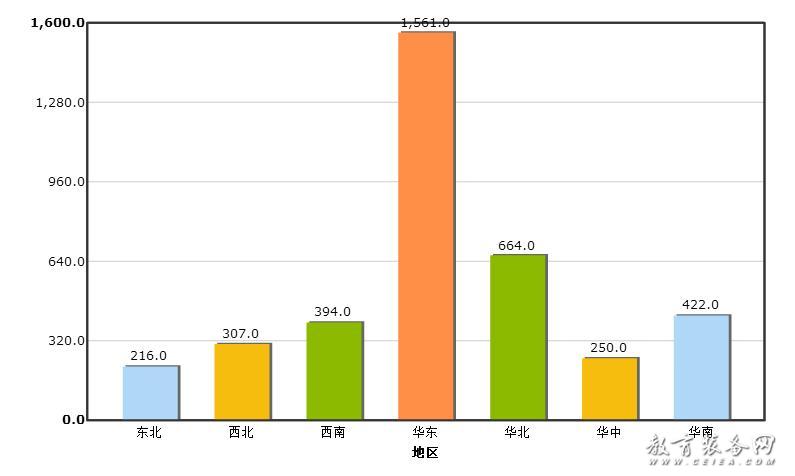 根據(jù)9月份收集到的教育裝備招標(biāo)采購信息(見圖2、圖3):教育裝備招標(biāo)采購區(qū)域信息數(shù)據(jù)共3814條(招標(biāo)采購信息地區(qū)設(shè)置為單選項)。其中,華東地區(qū)招標(biāo)采購信息量1561條,占區(qū)域信息量的40.93%;華北地區(qū)招標(biāo)采購信息量664條,占區(qū)域信息量的17.41%;華南地區(qū)招標(biāo)采購信息量422條,占區(qū)域信息量的11.06%;西南地區(qū)招標(biāo)采購信息量394條,占區(qū)域信息量的10.33%;西北地區(qū)招標(biāo)采購信息量307條,占區(qū)域信息量的8.05%;華中地區(qū)教育裝備招標(biāo)采購信息量均為250條,占區(qū)域信息量的6.55%;東北地區(qū)招標(biāo)采購信息量216條,占區(qū)域信息量的5.66%。
