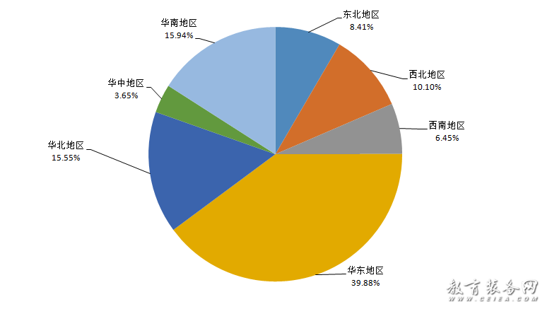 9月份教育裝備中標(biāo)采購區(qū)域信息數(shù)據(jù)共3613條(中標(biāo)信息區(qū)域設(shè)置為單選項)見圖6、圖7,華東地區(qū)中標(biāo)信息量1441條,占區(qū)域信息量的39.88%;華南地區(qū)中標(biāo)信息量576條,占區(qū)域信息量的15.94%;華北地區(qū)中標(biāo)信息量562條,占區(qū)域信息量的15.55%;西北地區(qū)中標(biāo)信息量365條,占區(qū)域信息量的10.10%;東北地區(qū)教育裝備中標(biāo)信息量304條,占區(qū)域信息量的8.41%;西南地區(qū)中標(biāo)信息量233條,占區(qū)域信息量的6.45%;華中地區(qū)中標(biāo)信息量132條,占區(qū)域信息量的3.65%。