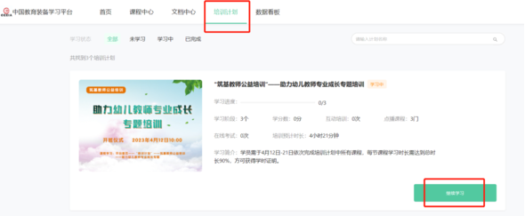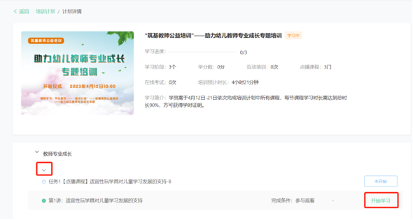 課程學習:4月12日14:00—21日24:00,在平臺首頁——“培訓計劃”,找到《“筑基教師公益培訓”——助力幼兒教師專業(yè)成長》計劃,點擊“開始學習”進入計劃,依次學習課程。