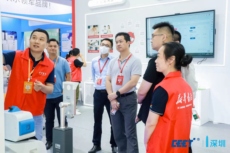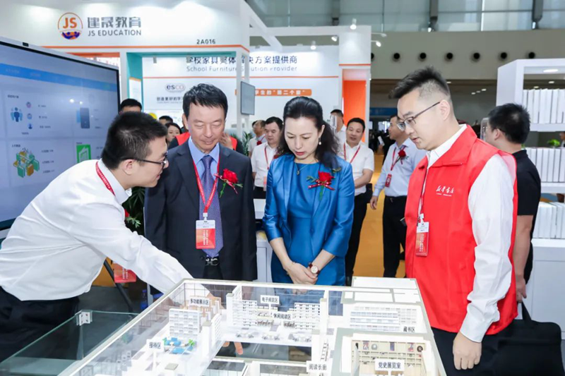 9月15日,開幕式典禮結束后,福田區委常委、統戰部部長吳歡,深圳市教育局原二級巡視員張淶臨,教育部關心下一代工作委員會常務副主任主任、中國教育裝備行業協會專家委員會主任委員王富,教育部教育技術與資源發展中心(中央電化教育館)學術委員會副主任委員、標準處處長劉強,深圳市教育裝備中心主任張惠敏等一行人巡展,深圳市教育裝備行業協會會長彭錦環陪同巡展。