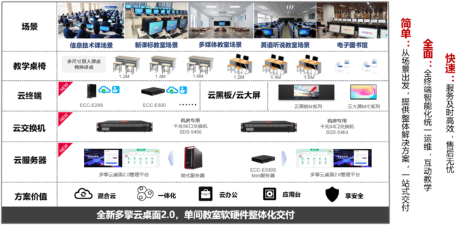 聯(lián)想多擎云桌面解決方案2.0,由云服務(wù)器、云終端、云交換機(jī)、云黑板/大屏、配套課桌椅組成,采用了國際領(lǐng)先的云桌面虛擬化技術(shù),包括VDI、VOI、IDV、TCI四種云桌面架構(gòu),作為方案的“引擎”,實(shí)現(xiàn)未來云教室統(tǒng)一融合管理。該方案可選擇公有云、私有云和混合云等多種接入方式,將計(jì)算機(jī)應(yīng)用的全場景云化管理,助力學(xué)校打造“一校一云一平臺”整體解決方案。同時(shí),云桌面適配國產(chǎn)化芯片和操作系統(tǒng),滿足教育信息技術(shù)應(yīng)用創(chuàng)新建設(shè)的要求。