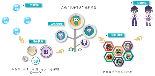 根據評價的指標,學生獲得積分,積分達到規定的數值,學生在智慧評價系統里的“數字孿生”虛擬角色就自動生成相應顏色的“云錦吉祥物”,學生數字孿生經歷“云錦吉祥物-云錦小神獸-云錦榜樣”三級角色升級,精準而又生動地反饋著學生的綜合素質表現,指向學生全面發展。