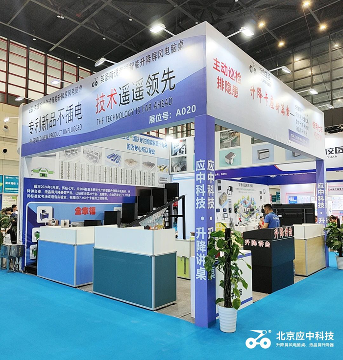 應中科技本次展出的明星產品升降屏風電腦桌和液晶屏升降器自上市開始就在教育裝備行業得到廣泛應用,創造了連續多年市場占有率超50%的佳話,目前已在全國28個省、市、自治區,800多所學校,1700余間教室投入使用。