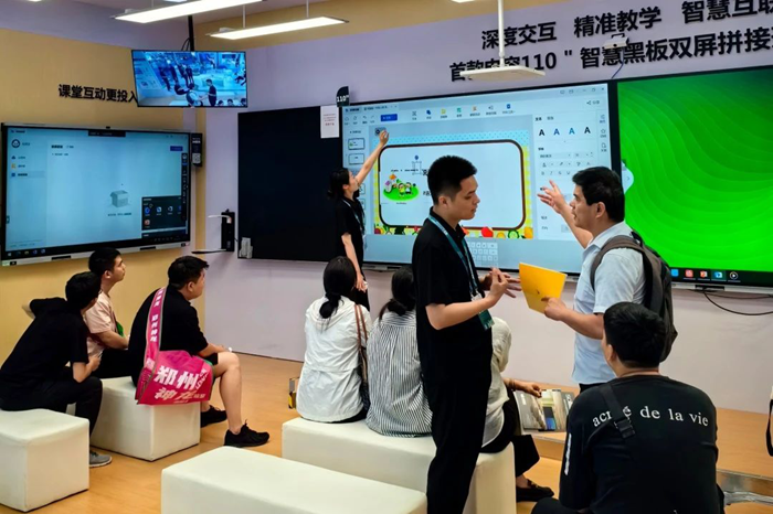在智慧教室場景中,安道教育展示首款電容110寸雙屏拼接形態(tài)的智慧黑板Q系列,可實現(xiàn)多種教學模式的切換,適合各類教室應用需求,其高度集成的功能特色受到眾多參展者的青睞。