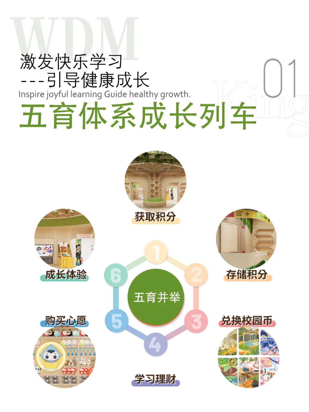 校園文化作為滋養(yǎng)學(xué)生成長的精神紐帶,在五育并舉的教育理念下,其作用愈發(fā)凸顯。“成長列車”的空間布局遵循“動線即課程”的設(shè)計邏輯,帶著學(xué)生走入“五育”的趣味互動,助力學(xué)生全面成長。五育評價體系滲透于課程、活動與環(huán)境之中,通過價值引領(lǐng)(德育)、知識奠基(智育)、強健根基(體育)、審美浸潤(美育)、實踐淬煉(勞育)五個維度形成協(xié)同體系。